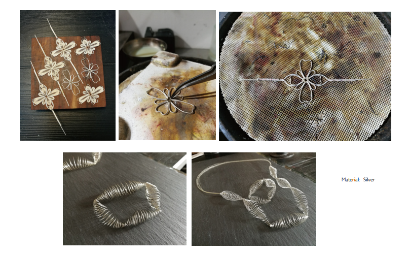 首先是调研部分,需要展现作品的灵感来源和构思。接着是设计草图,草图可以多放几个,从最初稿到定稿,其过程可以都呈现出来。然后是材料的选择,如果选择的材料比较便宜,可以选择做出实物。如果选材是比较贵重的宝石,可以不制作出实物,但是需要手绘出比较详细的效果图(参见文章图三图四)。最后就是佩戴效果图的拍摄。